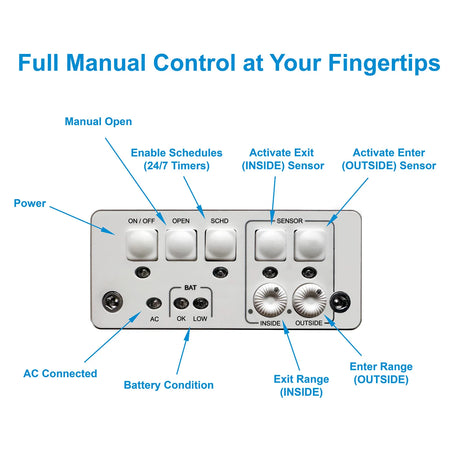 In most cases, the one-way, outside access control only works fine. Here are the situations in which 4-way access control from both directions can be an advantage: You want to keep an inside pet (or child) from going outside in addition to preventing strays and other animals from coming inside. You are concerned about raccoons coming in through the pet door. At least some raccoons have figured out that a one-way control electronic pet door can be broken into by hooking the flap with a claw and pulling the flap toward the outside. Then they can come through the opening. No one knows if every raccoon can do this, but they are very clever.