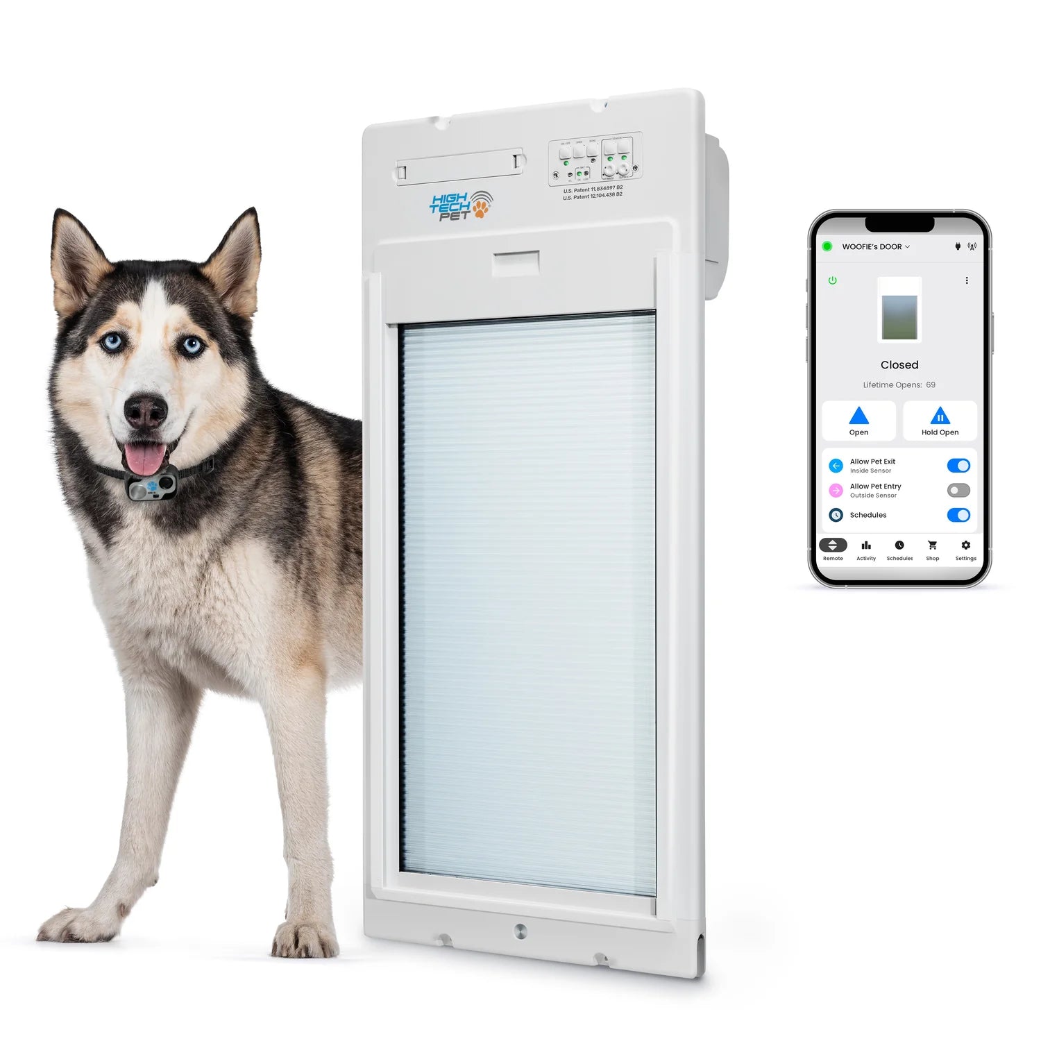The smartphone controlled WiFi Pet Door connects to your home's wifi and can be controlled remotely with an integrated smartphone app. You can set up to 20 custom timers to regulate your pet's access and keep track of the sensor-triggered events through the app's history feature. Comes with an MS-5 collar key.